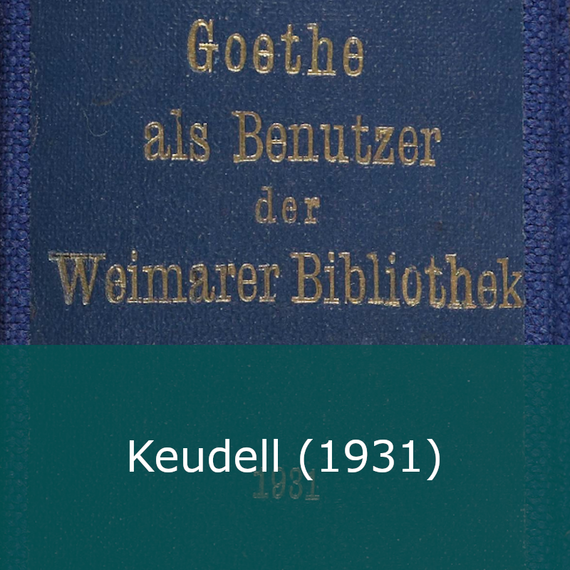 ![]() | Die Grundlage dieses Verzeichnisses von Elise von Keudell (1867–1952) sind die in der Herzogin Anna Amalia Bibliothek erhaltenen, handgeschriebenen Ausleihjournale aus der Goethezeit. Die von Goethe entliehenen Werke sind in chronologischer Reihenfolge aufgeführt. In ihrem durchschossenen Handexemplar, das hier gezeigt wird, vermerkte Keudell zugeordnete Signaturen und Verweise auf Tagebucheinträge und Briefe Goethes. . | |