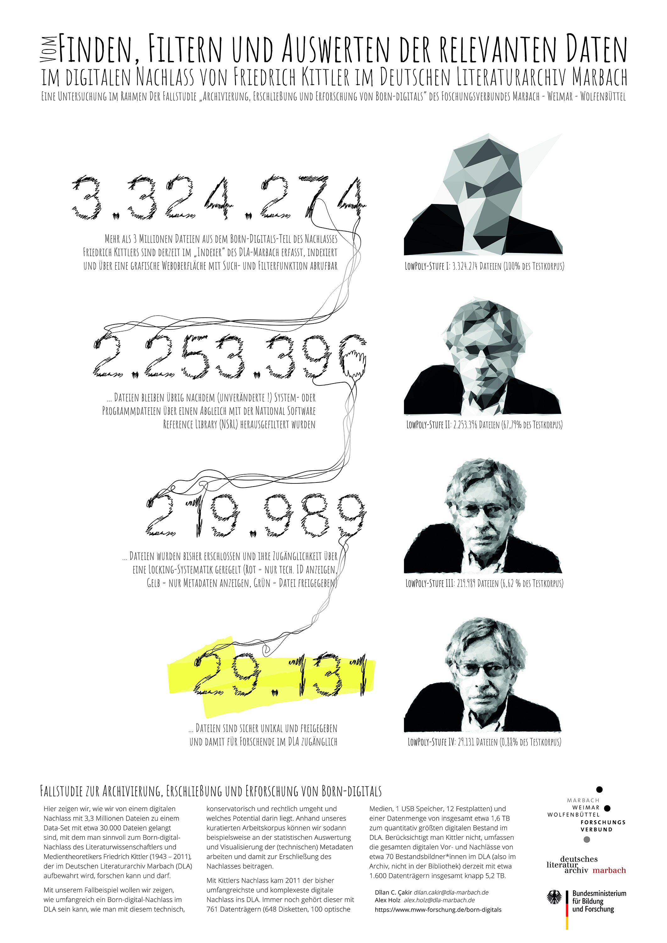 Für die Erforschung der Born-digitals werden solche wissenschaftlichen Fragestellungen in Bezug auf Computerspiele (als eine Form der digitalen Literatur im DLA) untersucht. Die Bibliothek des DLA erwirbt, erschließt und archiviert Computerspiele innerhalb ihres Sammelauftrags seit 2019. Die Sammlung befindet sich derzeit im Aufbau. Die bisher erfassten und archivierten Titel sind bibliografisch im Marbacher Online-Katalog Kallías nachgewiesen. Die (digitale) Bereitstellung und technische Langzeitarchivierung der Computerspiele für die wissenschaftliche Forschung sollen in weiteren Projekten konzipiert werden. Zur Erforschung und Erschließung digitaler Autor*innennachlässe dient der Kittler-Nachlass im DLA. Mit mehr als zwei Millionen Dateien und ca. 1,1 Terabyte Speicherplatz handelt es sich bei diesem Nachlass um einen paradigmatischen digitalen Großbestand des 20. und frühen 21. Jahrhunderts, anhand dessen sich neue Verfahren erproben lassen. Die in der Fallstudie gewonnenen Erkenntnisse werden in die Forschungsgruppen eingebracht, Fragestellungen durch die dort stattfindenden Diskussionen präzisiert und erweitert.